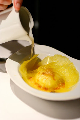 The barbeque-smoked scalope of foie gras demonstrated the ingenious creativity of playing texture, having the outer layer of the foie gras mimicking those of a scallop. It was also widely reported that Chef Aduriz had spend some time in a university hospital liver transplant unit to study the cell structures of duck livers. Talk about dedication bordering on obsessiveness. You can also see him pay homage to his birth region of Basque with the "ocean and land" dish with a twist. The braised Iberian pork tails and pan fried languostines with reduced braising juice infused with iberian jamón was very hearty and satisfying. Then there was the famous coal meat, where a piece of Milk Veal was roasted and coated with edible vegetable coloring to produce a piece of coal-look-alike, when it is in fact a piece of meat. The charred twigs were actually crisp radishes. This dish was one of the most complex dish we had ever had and yet one we can easily relate to. Chef Aduriz had mentioned before that one of his childhood taste was the smell of the coal used for cooking lamb when he went to his father's village (Tony's trademark question on No Reservation). The visual impact from the black coal like looking veal and the charred smell of coal would no doubt recall the memory of countryside. But yet, nothing says more than urban sophistication of the technique used to produce this food when you cut through the black coal-meat and see the white-milkishness color of the baby veal. The taste was almost secondary at that point, but it did not fail to deliver. Full savory goodness. It was truly, an assault on all the senses.